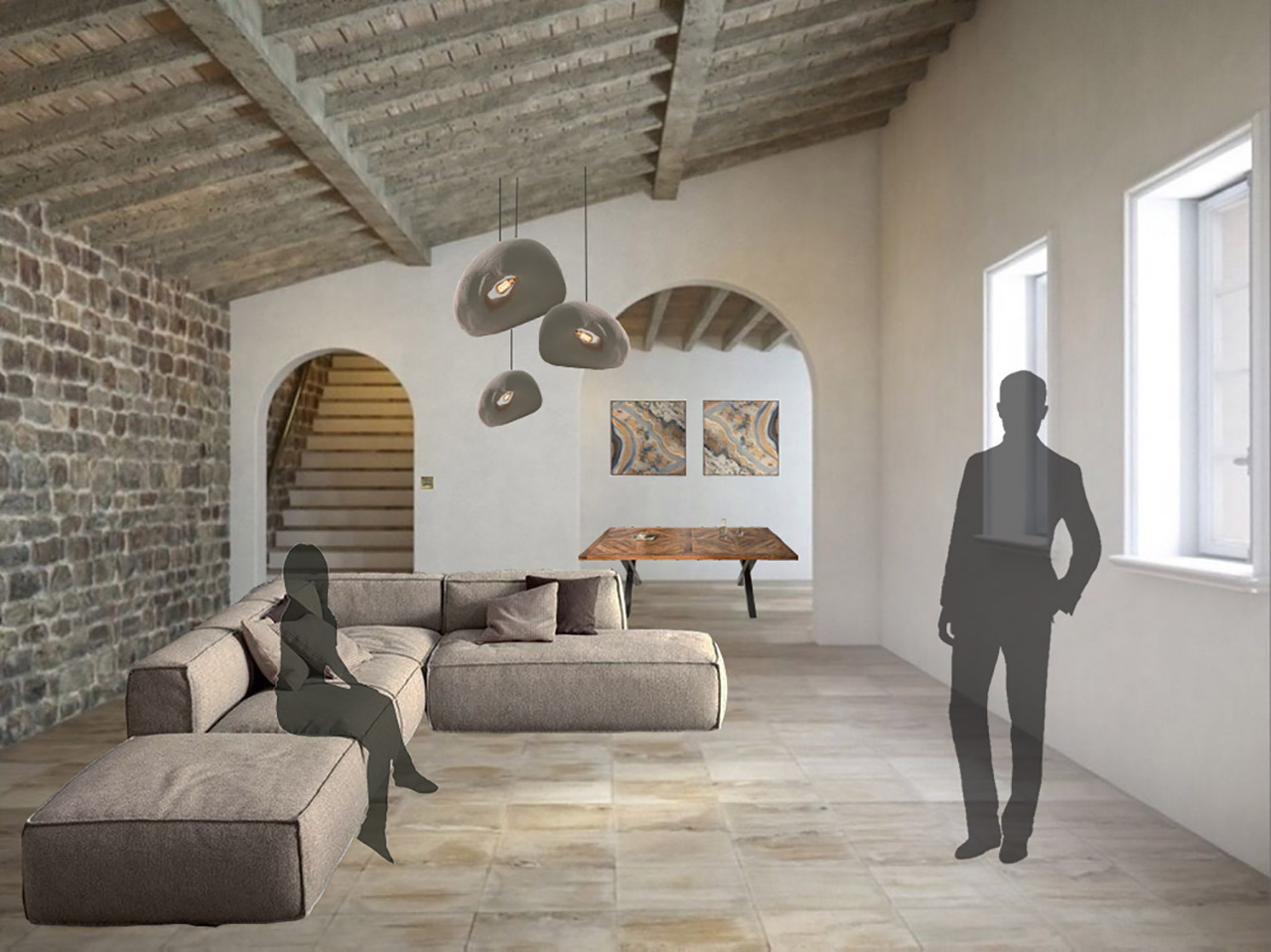 The visuals below created in Photoshop incorporate my clay models into the scenes. Along with my lights, the furniture and people where added.